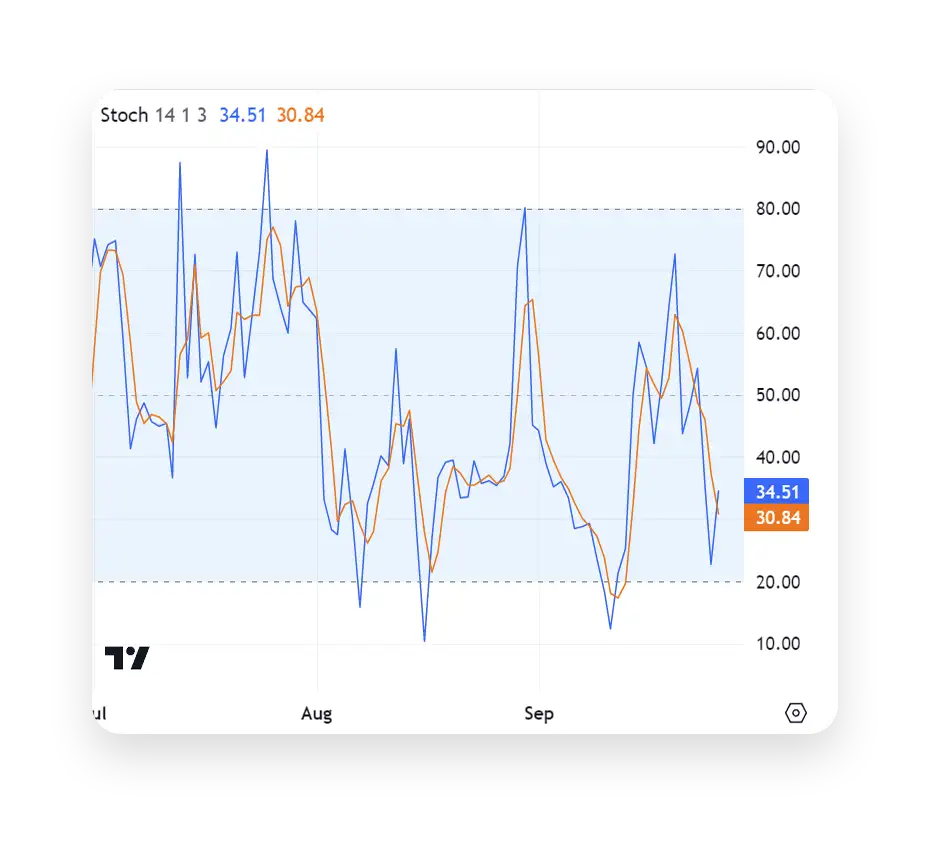 - Overbought/Oversold: Levels above 80 are considered overbought, and levels below 20 are considered oversold, signalling potential reversals.